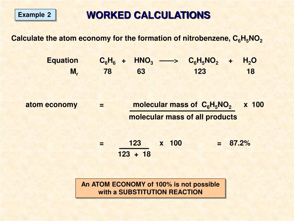 Percentage yield is calculated from the mass of reactants and the mass of products... Because neither elimination, addition or substitution of atoms is taking place, in the molecule undergoing rearrangement, the atom economy of rearrangement reactions is 100% and they are environmentally preferable reactions from an atom economy … The percentage atom economy of a reaction is calculated using this equation: Percentage yield is calculated from the mass of reactants and the mass of products. 01.07.2020 · atom economy is the percentage of the total mass of reactants that successfully converted to the desired product. % atom economy = (fw of atoms utilized/fw of all reactants) x 100 = (137 /137) x 100 = 100% atom economy in rearrangement reactions rearrangement reactions involve reorganization of the atoms of a molecule.. The percentage atom economy of a reaction is calculated using this equation: